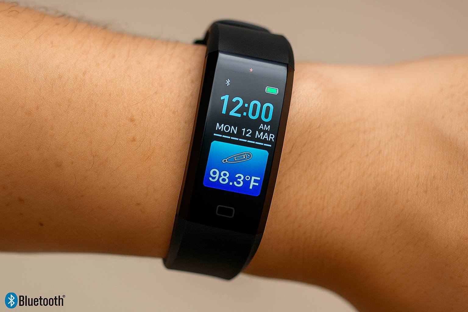 Pulsera para el control global de la salud. Facilita el control de las constantes vitales ofreciendo datos de saturación de oxígeno en sangre, temperatura corporal, ritmo cardíaco y presión arterial.