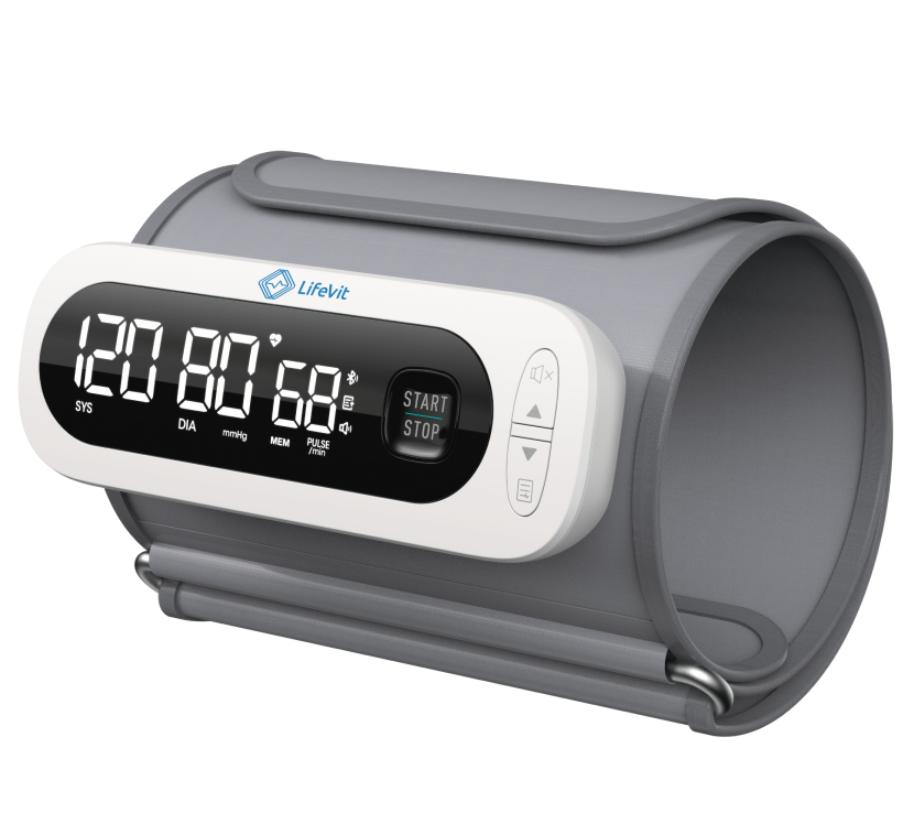 Tensiómetro de brazo inteligente con conexión bluetooth que ofrece medición de sístole, diástole y pulso. El display es de tamaño XL para facilitar su lectura.